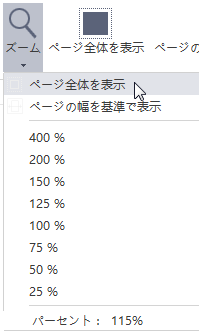 - 「表示」タブで「ズーム」ボタンをクリックし、ズーム率を選択します。