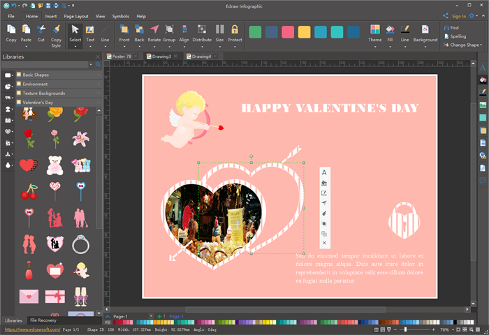 This software also offers users a library of free vector valentine's day symbols to design cards. All images are customizable. You can adjust its dimensions, colors and directions, etc.