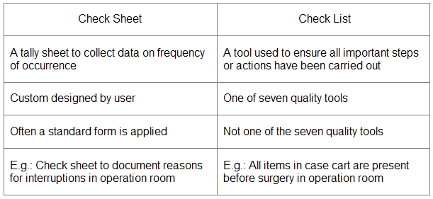 The check sheet is a form (document) used to gather data in real time at the location where the data is generated. The data it obtains can be quantitative or qualitative. When the information is quantitative, the check sheet is sometimes called a tally sheet. It is sometimes referred to as a concentration diagram or location plot. It is a handy tool for data collecting and analysis.