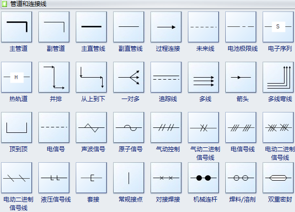工艺流程图用管道线表示介质在设备之间如何传输。这些符号在图中表示设备怎样相互连接,以及需要用什么介质(如电,气动的,信息等)。