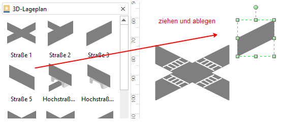 • Gehen Sie zum Bibliothek Bereich auf der linken Seite der Leinwand. Ziehen Sie die Straßen-Formen aus 3D-Lageplan auf das Zeichenblatt.