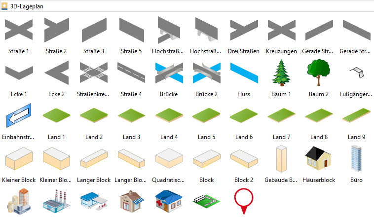 Ziehen Sie weitere Formen aus der Bibliothek, wie Brücken, Flüsse, Gebäude, Autos und Bäume auf die Lagepläne. Neben der 3D-Bibliothek könnten Sie erforderliche Symbole in anderen Bibliotheken finden.