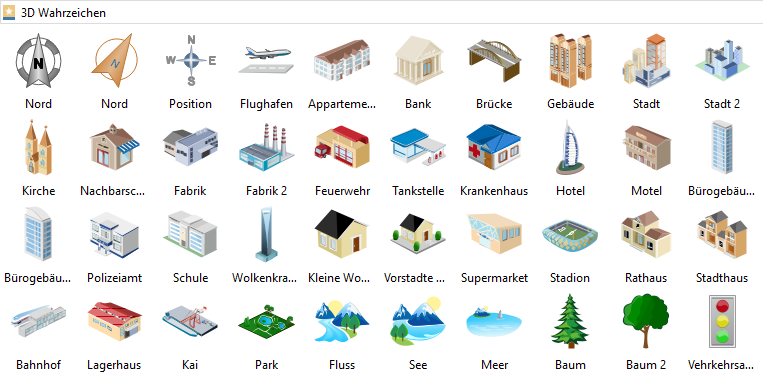 • 3D Symbole für visualisierte und lebensechte Landkarte.