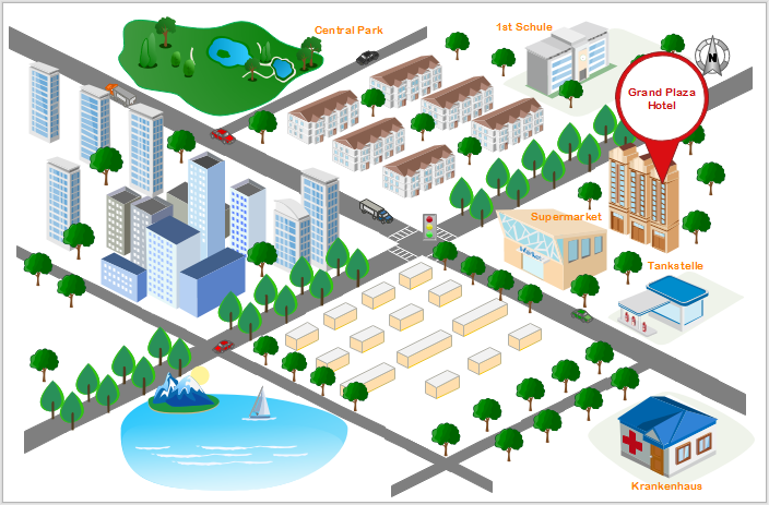 Benutzerfreundliche 3D Lagepläne Software hilft Ihnen 3D Lagepläne und Straßenkarten mit vorgefertigten Formen, Wahrzeichen und Fahrzeuge zu erstellen. In nur wenigen Minuten können Sie eigene 3D Lagepläne ohne zeichnerische Fähigkeit zeichnen.