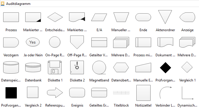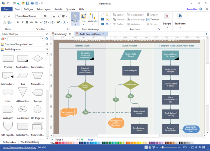 Klicken Sie hier zum Download der Auditdiagramm Software. Dann können Sie die integrierten Auditdiagramm-Vorlagen nutzen, um Ihre Geschäftsprozesse in Minuten zu erstellen und zu präsentieren.