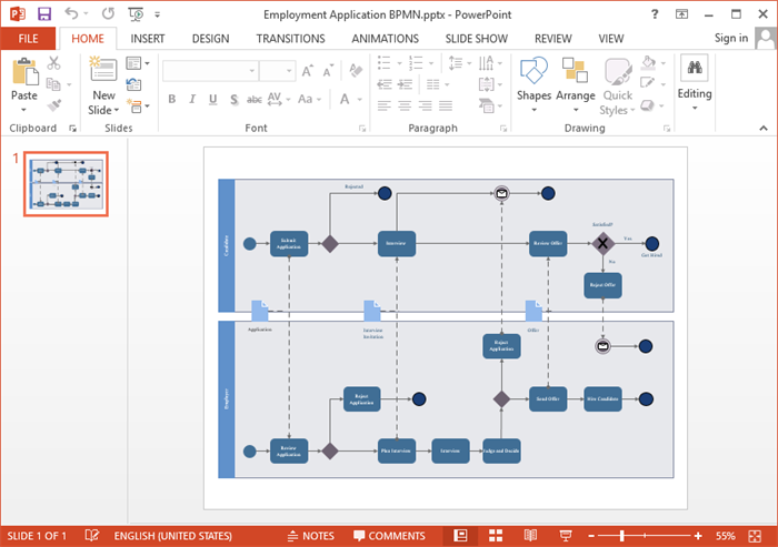 Das exportierte BPMN-Diagramm wird in MS PowerPoint weiterhin als Vektor dargestellt. Sie können in MS PowerPoint immer noch Text bearbeiten, Formen einfärben und Schnellformatierungen anwenden. Entdecken Sie, warum Edraw ein hervorragendes Programm zur Erstellung von BPMN für Word ist. Testen Sie weitere BPMN-Diagrammbeispiele.