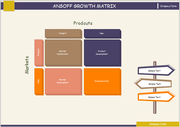 Ein Beispiel der Ansoff-Matrix zeigt ein einfaches Ansoff-Matrix-Modell. Designer können die folgen Ansoff-Matrix-Vorlage verwenden, um der wachsenden Marketinganalyse zu starten.