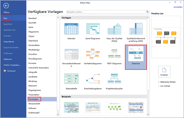 Um die Zeitleiste-Vorlage zu finden, navigieren Sie durch die Datei > Neu > Terminplan > Zeitachse von Startseite in Edraw. Wenn die Zeitachse-Beispiele geöffnet wird, werden Sie eine Vielzahl von Zeitleisten zur Auswahl.