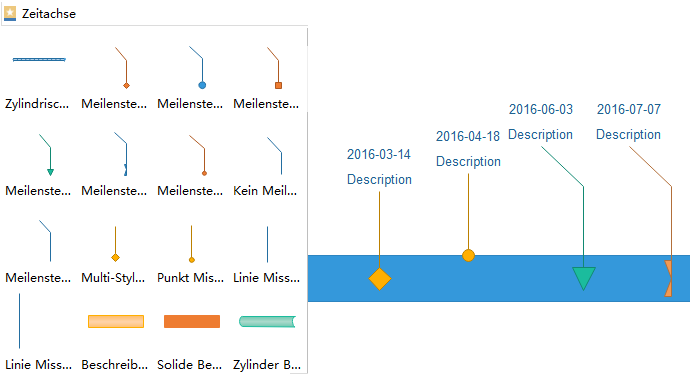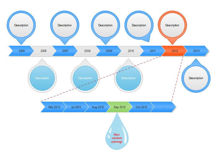 Ausreichende Symbole einschließlich gemeinsame Formen, Zeitleisten und Titelleisten, Beschriftungen werden aufwendig gezeichnet. So entwickeln Sie individuellen Zeitachse in wenigen Minuten mit Drag-and-Drop-Funktionalität.