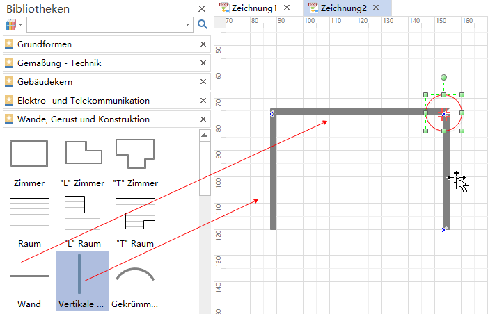 - Aus der Bibliothek links, ziehen und legen Sie die Grundriss Symbole auf das Zeichenblatt. Wenn Sie die Shapes verschieben, werden Ihnen die Gitternetzlinien und die dynamische blaue Richtlinien helfen, die Shapes mit einander auszurichten.