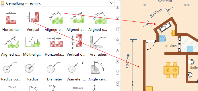Dimensionen können zum Grundriss hinzugefügt werden, um die präzise Messung und Maßstab anzuzeigen. Die Bibliothek "Gemaßung-Technik" enthalten viele intelligente Bemaßung-Symbole, dadurch können die Anwender mit dem innere Dimension, Außenmaße, Winkelbemaßung, Radiusbemaßung mehr virtuell und intuitiv zeichnen oder zeigen.