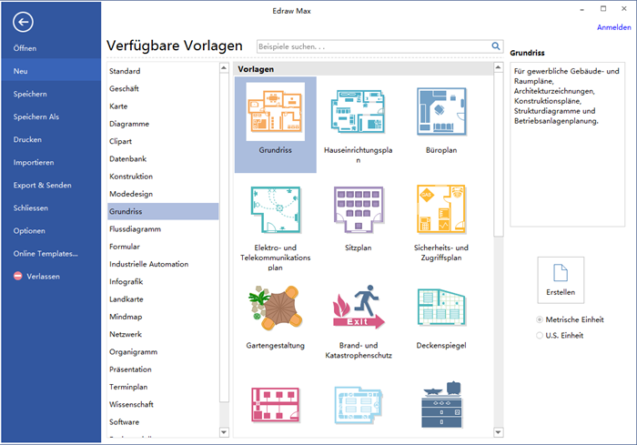 Auf den Datei Menü, klicken Sie auf Neu--> Grundriss, unter den mehreren Vorlagen wählen Sie eins aus, was für ein Grundriss wollen Sie erstellen. Büroplan, Gartengestaltung oder anderes, doppelklicken und dann ist das leere Zeichenblatt geöffnet.