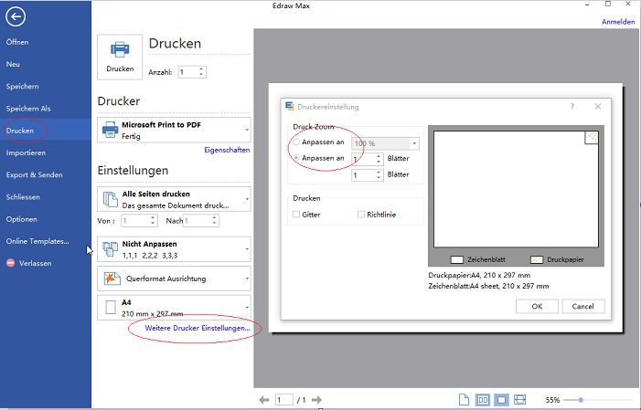 Wenn das Papier größer als das Druckerpapier ist, wird der Ausdruck auf andere Seiten verteilt. Um ihm auf nur 1 Papier zu drucken, klicken Sie Weitere Drucker Einstellungen... und wählen dann Anpassen.