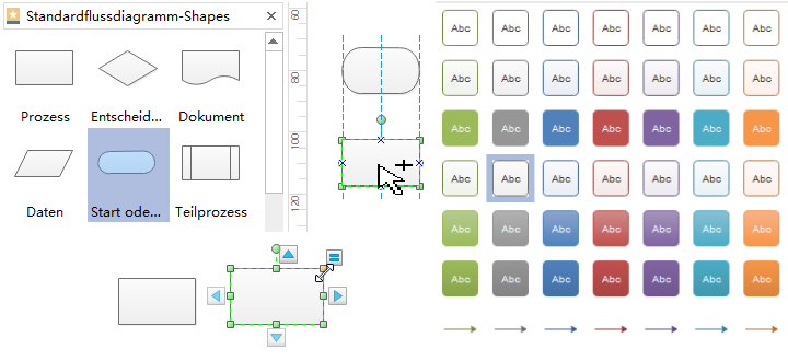 Hinweis: Klicken Sie auf den kleinen Pfeil Button eines Shapes, wird ein gleiches Shape als das nächste Prozessschritt automatisch verbunden. Wenn Sie das Shape für eine andere Forme ersetzen wollen, klicken Sie auf das Button rechts oben des Shapes, dann können Sie auswählen für welche Pfeilrichtung und den Pfeiltyp brauchen Sie: Prozess, Start/End, Teilprozess, Entscheidung, Dokument.