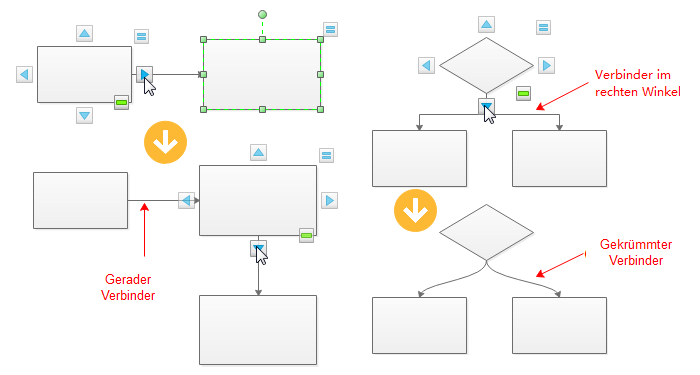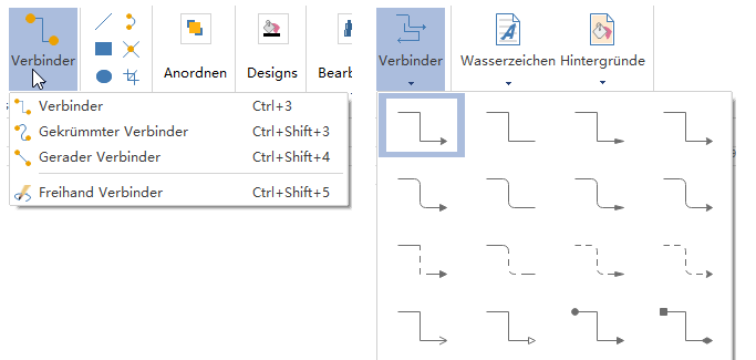 2) Wenn 2 Formen ausgerichtet sind, entsteht ein gerader Verbinder. Wenn dies nicht der Fall ist, wird ein Winkelstecker angezeigt. ->Sie können den Verbindertyp durch Rechtsklicken des Verbinders ändern. Benutzen sie unter Start Tab das Verbinder Werkzeug, um die Formen manuell zu verbinden. Sie können aus Verbinder, Gekrümmter Verbinder, Gerader Verbinder, oder Freihand Verbinder wählen.