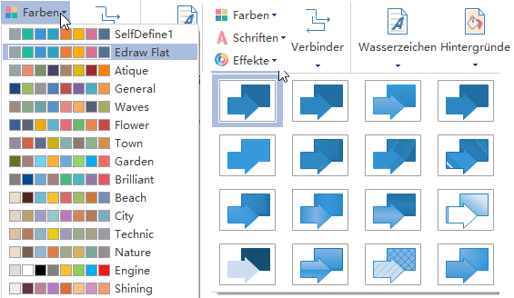 1) Um der Thema des Flussdiagramms anzupassen, können Sie die Füllung und Liniefarbe insgesamt mit 1 Klick ändern. Auf der Registerkarte Seiten Layout wählen Sie ein Thema aus.