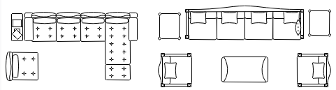 - Wohnzimmer: Für die Einrichtung des Wohnzimmers können Sie Symbole wie Sofas, Sessel, Unterhaltungsgeräte, Lampen, Couchtische, runde Tische und mehr verwenden.