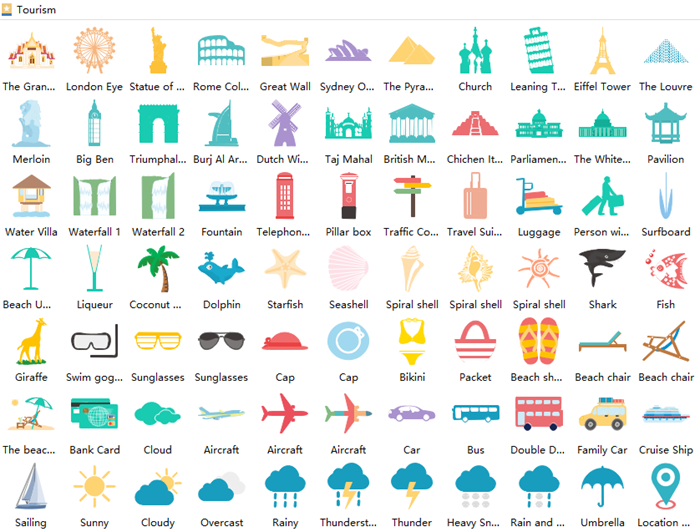 Edraw enthält viele Clip-Arts, Symbole wie Flugzeuge, Wolken, Sonnenschirm, die Tourismus-Infografiken machen können.