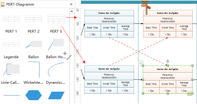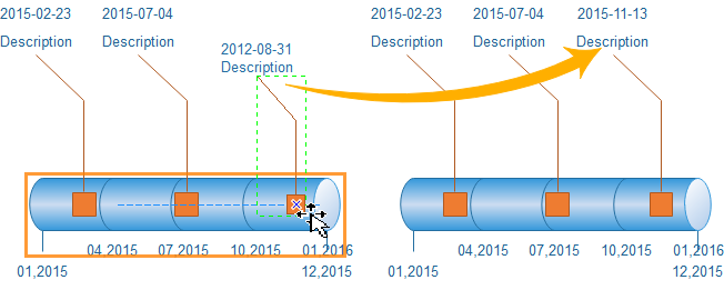 Die Zeitleiste-Formen sind intelligenter. Wenn Sie in der Zeitleiste Meilenstein-Form ziehen, wird hier eine orangefarbene Box zeigen. Alle Meilenstein-Shapes in der orangen Box werden automatisch ausgerichtet werden. Die Daten der Meilenstein-Form ändern sich auch automatisch nach seiner Lage.