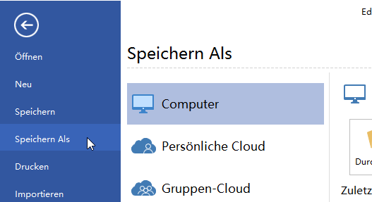 Klicken Sie Speichern auf den Datei Tab als das Standard-Format zu Speichern. Speichern als auf den Datei Tab als die andere Formate zu speichern. Sie können die Dateien als lokale Dateien oder in Ihrem Cloud speichern.