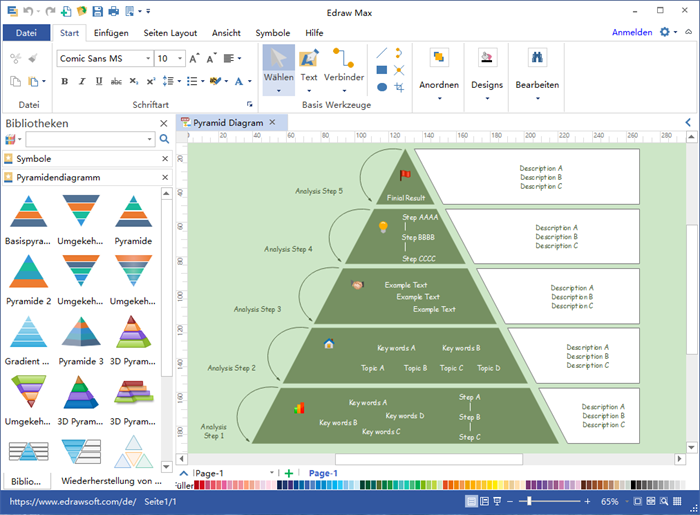 Edraw Max, ein Geschäftsgrafiken-Paket enthält einige integrierte Symbole für Designer, damit sie alle Arten von Pyramidendiagrammen zeichnen können. Finden Sie die Symbole in den Bibliotheken Liste, Prozess, Diagramme und Grafiken. Es ist eine gute Wahl für die Benutzer, entweder einen Anfänger oder einen Master. Es ist leicht erreichbar, sodass die Anfänger es benutzen können. Und es gibt erweiterte Funktionen für erfahrene Designer.