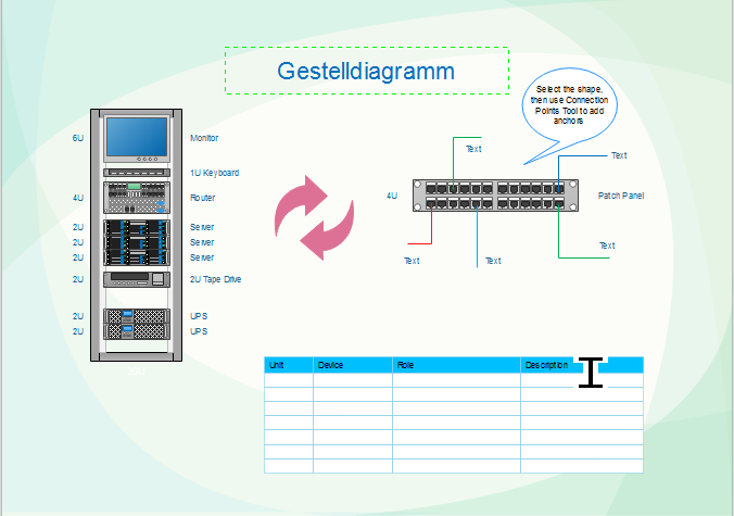 Dies ist ein Beispiel für ein einfaches Diagramm eines Server Racks. In der Abbildung unten sehen Sie alle im Rack enthaltenen Elemente, wie z.B. einen Monitor, ein Patchpanel, einen Server, etc. Das Diagramm kann hilfreich sein, vor allem für Neulinge oder Personen, die keine Ahnung haben, wie man ein Rack-Diagramm erstellt. Es ist leicht zu verstehen und kann individuell angepasst werden. Sie können die Beschriftungen ändern, Symbole hinzufügen und die Symbole oder Elemente an Ihre Bedürfnisse anpassen.