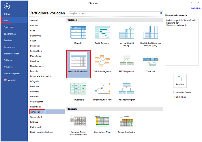 Öffnen Sie Edraw, klicken auf Neu > Terminplan > Verwandtschaftsmatrix auf Startseite in Edraw.