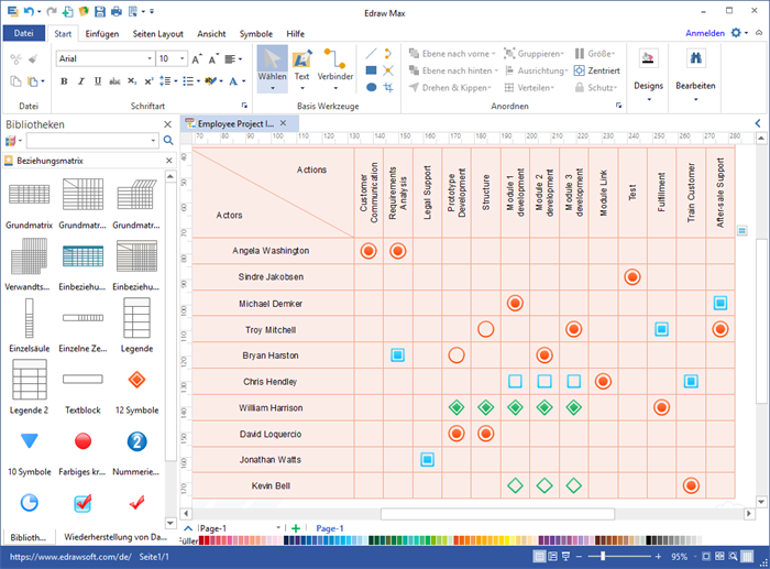 Edraw Max, als die beliebtesten Business-Diagramm-Software, bietet einige kostenlose Beziehungsmatrix-Vorlagen, die mehr Flexibilität als Excel-Arbeitsblättern haben. Zum Testen können Sie die Matrix Beispiele kostenlos herunterladen und sich selbst bearbeiten.