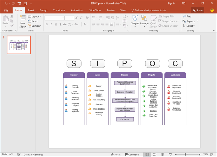 Hier bieten wir einige kostenlose Präsentation SIPOC-Vorlagen an, mit dem sich automatisch schöne SIPOC-Diagramme erstellen lassen.