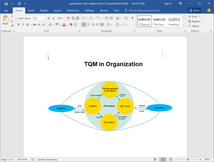Edraw ist eine benutzerfreundliche Software für Total-Quality-Management mit vorgefertigten Beispielen der TQM-Diagramme, kann jeder - auch ein Laie ohne Zeichnung-Erfahrung - ein elegantes, professionell aussehendes TQM-Diagramm für MS Word erstellen. Es ist einfach für jedermann, professionelle TQM-Diagramme in Minuten zu erstellen.