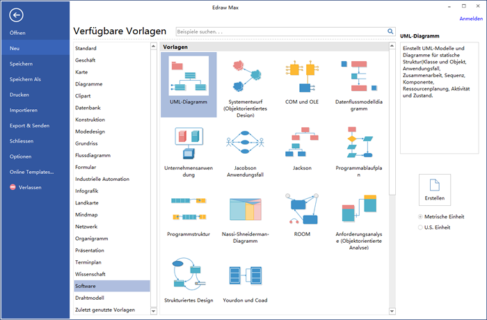 Klicken Sie im Menü Datei, auf Neu ->Software, und doppelklicken Sie dann auf das Ssymbol UML-Diagramm.