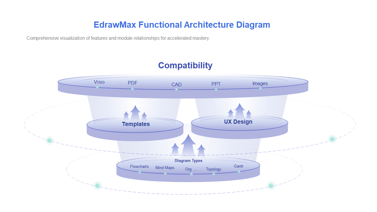 This diagram showcases the compatibility, templates, UX design, and various diagram types supported by EdrawMax, providing a comprehensive overview of its features.