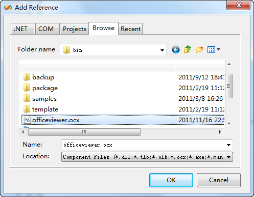 In the pop up dialog, choose the officeviewer.ocx file from the Browse tab.