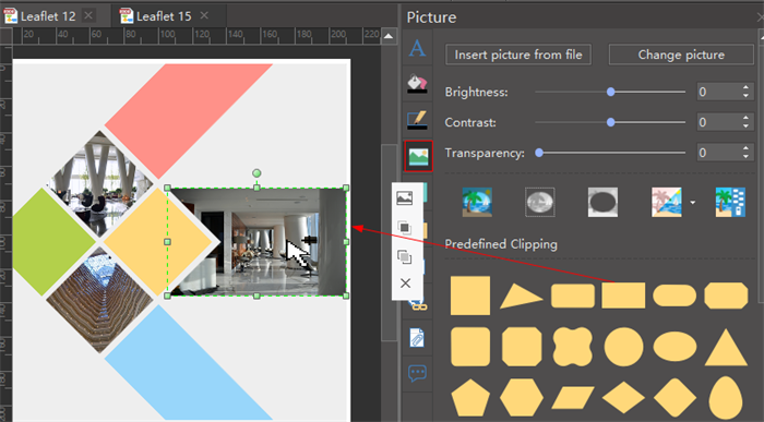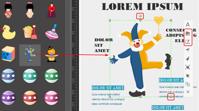 Step 4.2: Open the libraries of clip arts from the left of the canvas. Choose the clip arts and shapes you need. Drag and drop them to the canvas. Customize the elements you have chosen instantly with the following operations: rotate, fill, size, align style and layer etc.