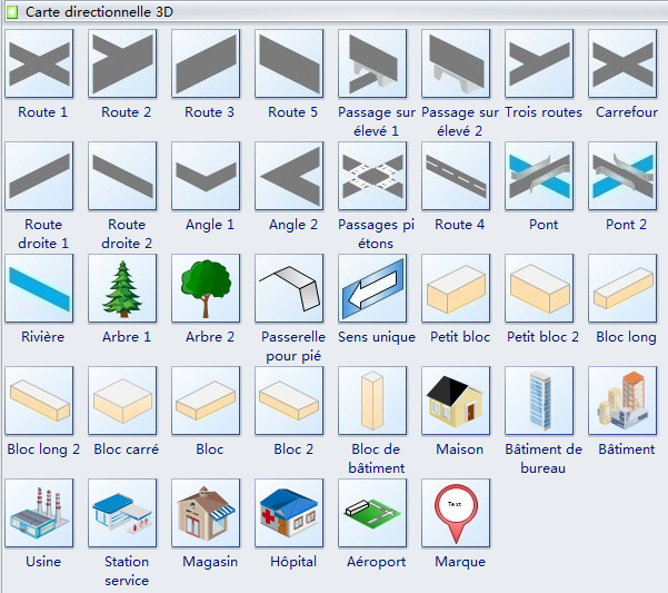 Les symboles de carte directionnelle 3D inclurent beaucoup de formes spéciales, la route, les routes d'arbres, le coin, les passages pour piétons, les ponts, la rivière, le pont piétonnier, la façon, le petit bloc, le long bloc, le bloc carré, les blocs de construction, maison, bureau, bâtiment, usine, etc. Toutes ces formes faciliteront votre dessin des cartes directionnelles 3D dont vous avez besoin.