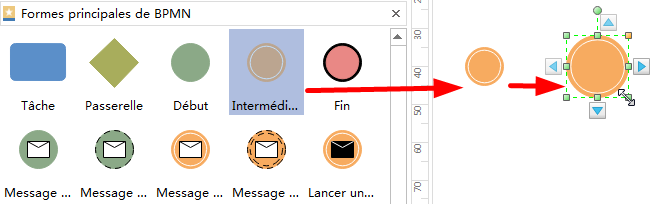 Faites glisser des formes à partir de la bibliothèque de diagramme BPMN au toile. Faites glisser les poignées carrées vertes pour redimensionner des formes.