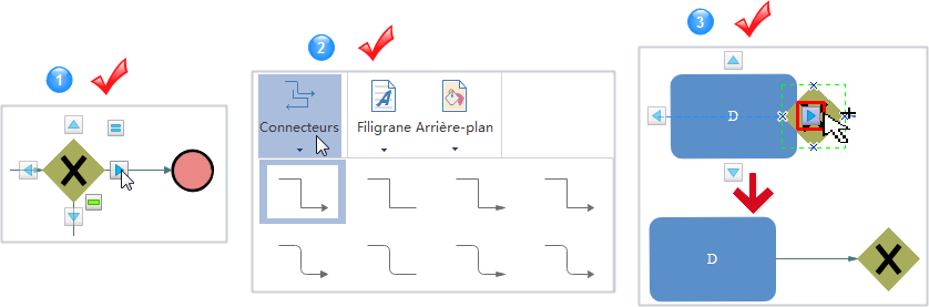 La spécification BPMN appelle à trois types de connecteurs: le flux de séquence, le flux de messages, et l'association. Les connecteurs que vous ajoutent en utilisant l'outil Connecter automatiquement sont des connecteurs de séquence de flux par défaut. Vous pouvez modifier le type en cliquant droit sur le connecteur et puis en cliquant sur le type que vous voulez dans le menu contextuel. Les connecteurs que vous ajoutent en utilisant l'outil Connecteur sont les connecteurs de flux de séquence par défaut.