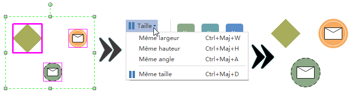 Vous pouvez utiliser l'outil Même taille sous l'onglet Accueil pour mettre several formes à la même taille.