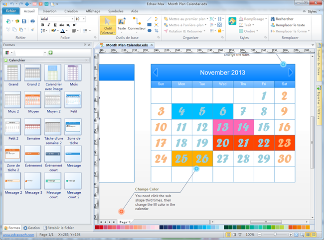 Edraw inclut certains modèles de calendrier intégrés pour le calendrier annuel, calendrier mensuel et le calendrier hebdomadaire. Ils sont des formes vectorielles et peuvent être imprimés et exportés au format HTML, SVG, JPEG et TIFF.