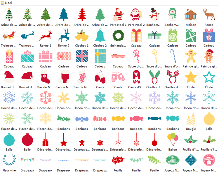 Edraw a inclus une grande collection d'illustrations de Noël bien conçues contenant bonhomme de neige, boules, chapeau, bas, maison, arbre de Noël, renne, guirlande, cadeau, bougies, père noël et plus pour aider avec votre projet de conception. Ils sont en format vectoriel, disponibles pour les présentations, les documents Word, les cartes de voeux de Noël et d'autres endroits. Vous le trouvez pratique et convivial lorsque vous avez besoin d'illustrations de fête Noël.