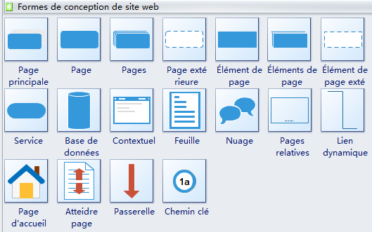 Le logiciel Edraw vous propose de nombreuses formes spéciales utilisées dans le schéma du site web conceptuel, telles que la page principale, la page, pages, la page externe, l'élément de la page, les éléments de page, la page externe, le service, la base de données, le contextuel, la forme, le nuage, les pages similaires, le connecteur dynamique, etc.