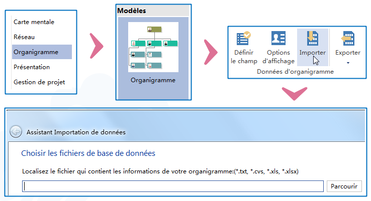 Deuxièmement, importer vos données. Cliquez sur l'onglet Organigramme. -> Dans le groupe Données d'organigramme, cliquez sur Importer. -> Localisez votre fichier de données, puis sélectionnez-le. -> Cliquez sur Suivant pour continuer.
