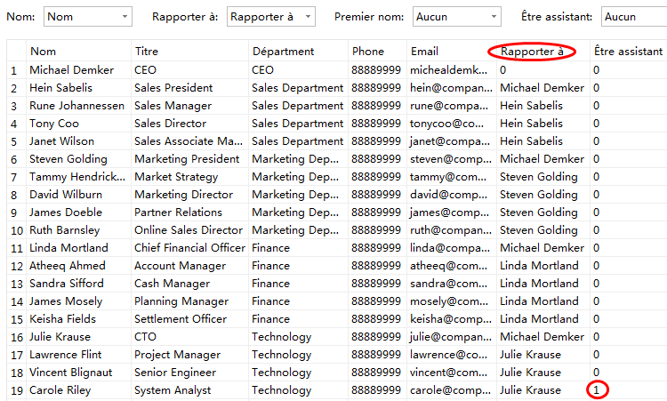 A rapporte à B signifie que A est le subordonné de B. Dans la colonne Être assistant, 0 signifie Non et 1 signifie Oui. Linda Stares est l'assistant du directeur général - Michael.