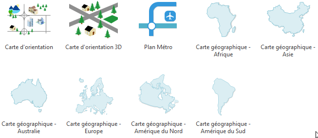 Contient des formes spéciales et les paramètres pour la création de carte directionnelle 2D, carte directionnelle 3D, cartes géographiques, plan de métro de la ville.