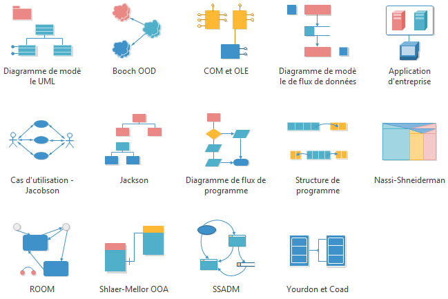 Facile à créer diagramme UML, Booch OOD, COM et OLE, diagramme de modèle de flux de données, application d'entreprise, cas d'utilisation - Jackbson, diagramme ROOM, Shlaer-Mellor OOA, la structure du programme, Nassi-Shneiderman et diagramme SSADM.