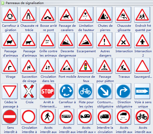 Le logiciel de carte Edraw vous offre beaucoup de panneaux de signalisation, danger lieu, intersection, virage, double virage, le trafic de deux façons, le pont mobile, l'annonce de feu, les passages pour les piétons, les travaux routiers, l'enregistrement, le croisement, la rue à sens unique, etc.