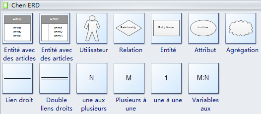 Les symboles suivants de diagramme entité-relation sont basés sur le Chen ERD. Chen ERD utilise les rectangles de représenter les entités, et les losanges de représenter les relations appropriées pour les objets de première classe. Si un ensemble d'entité participe à un ensemble de relations, elles sont reliées par une ligne. Les attributs sont dessinés comme des ovales et sont reliés par une ligne à une entité ou un ensemble de relation.