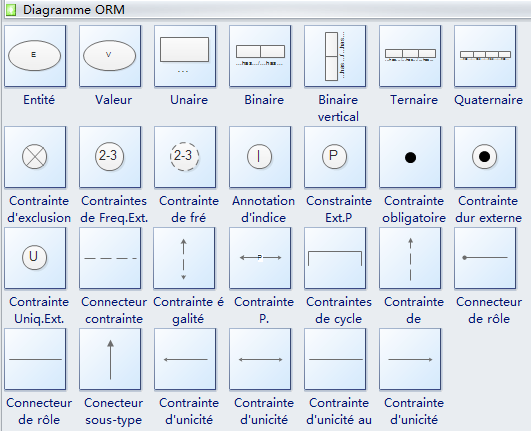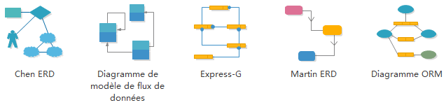 Edraw Max prend en charge cinq types de diagramme entité-relation. Les diagrammes entité-relation différents utilisent les différents symboles pour représenter les relations entre les entités dans une base de données pour la plupart des projets de gestion de l'information. Mais le diagramme ER utilise souvant les boites de representer les entites. Les losanges sont normalement utilisés pour représenter les relations et les ovales pour symboliser les attributs.