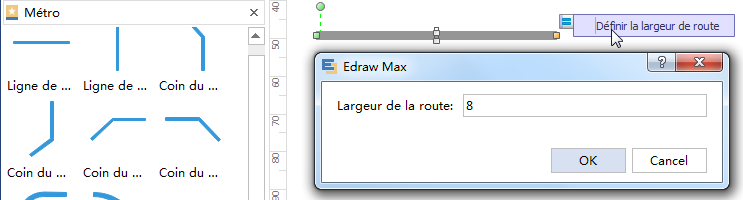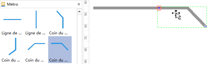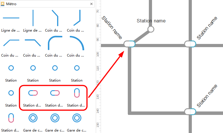 Faites glisser des symboles pré-dessinés de la bibliothèques Métro, utiliser les poignées et les boutons flottants pour modifier la longueur et la largeur.