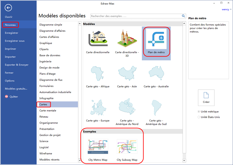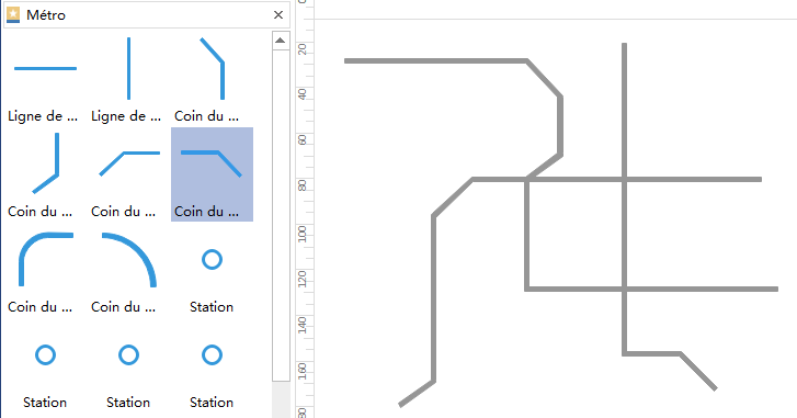 Sous l'onglet Fichier, pointez à Nouveau.-> Dans la catégorie Carte, cliquez sur Plan de métro, puis double cliquez sur l'icône de Plan de métro, et vous pouvez commencer à réaliser votre carte de métro à partir des symboles pré-dessinés.